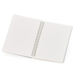 Caderno A5 com capa plástica e elástico para lacre, contém aproximadamente 80 folhas marfim com pauta.