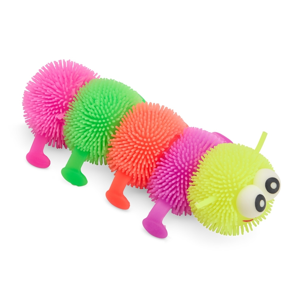 Centopeia antiestresse feita em silicone e borracha com textura macia, que pode ser apertada e esticada com facilidade. Conta com franjas espalhadas pelo corpo luz interna que acende ao ser tocada.