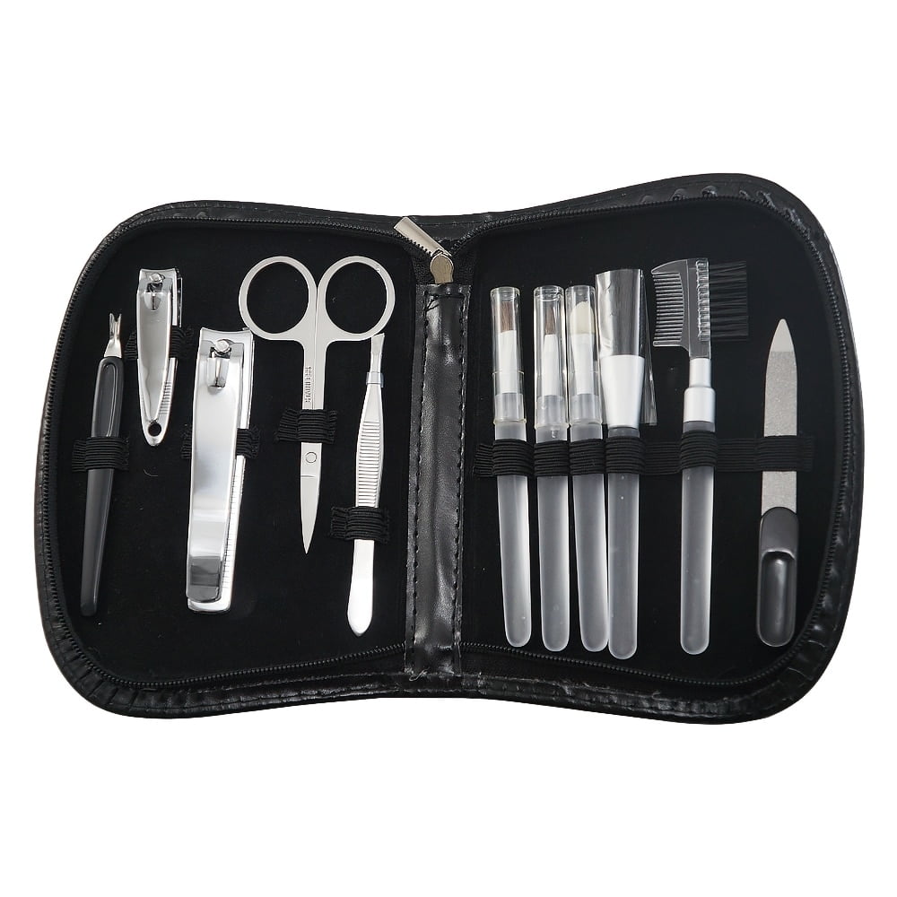 Kit manicure 11 peças em estojo de couro sintético. Possui: empurrador de cutícula, cortador de cutícula, cortador de unha, tesoura, pinça, pincel corretivo, pincel para sobrancelha, pincel para sombra, pincel para blush, pente para sobrancelha e lixa. Estojo de couro sintético com parte interna revestida com veludo e elásticos de nylon para fixar as peças.