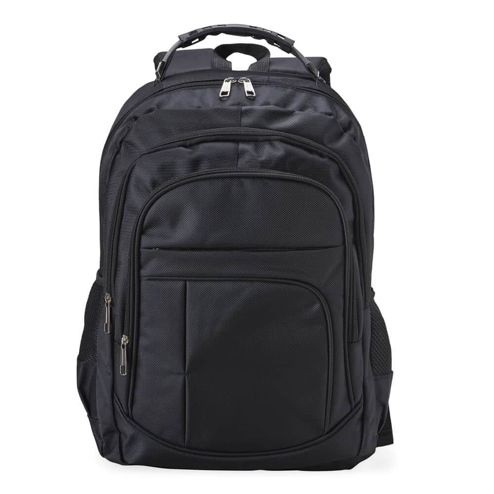 Mochila de nylon 30 litros com quatro compartimentos, sendo o principal com bolso para notebook 15,6. A mochila possui bolsos laterais em malha, duas alças de mãos e área costada com revestimento espumado.
